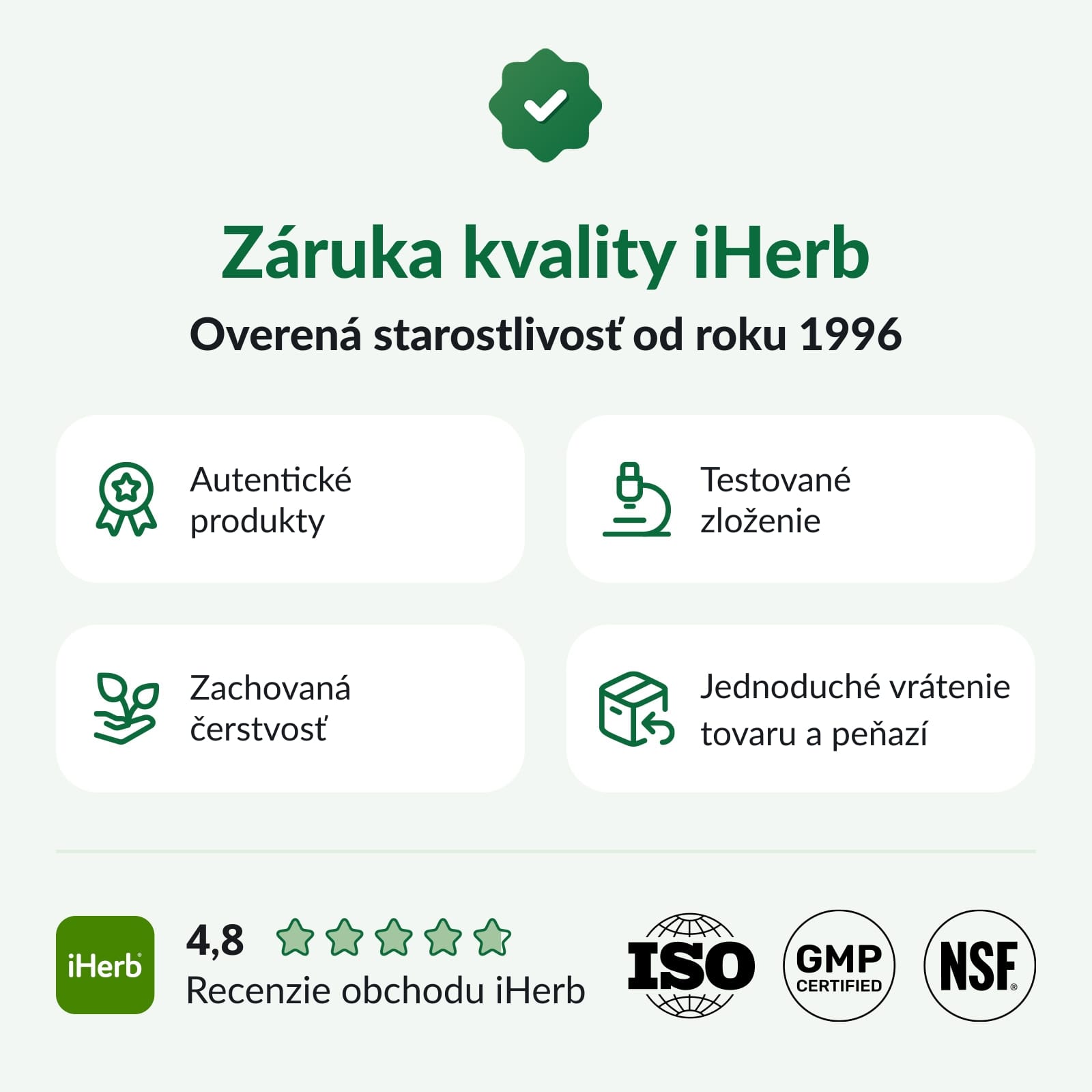 Spoločnosť iHerb sa snaží zabezpečiť presnosť zobrazených produktových obrázkov a informácií. Niektoré výrobné zmeny v balení a/alebo zložení sa však môžu zobraziť až po tom, čo vykonáme aktualizáciu našich stránok. Produkty môžu byť výnimočne dodané v odlišnom balení, pričom čerstvosť je vždy zaručená. Odporúčame, aby ste si pred použitím vždy prečítali etiketu, upozornenia a návod na použitie daného produktu a nespoliehali sa výlučne na informácie uvedené na stránke iHerb. Táto webová stránka bola preložená strojovým prekladom ako služba zákazníkom. iHerb neručí za úplnosť ani bezchybnosť prekladu a nezodpovedá za prípadné chyby alebo vynechania v preklade.